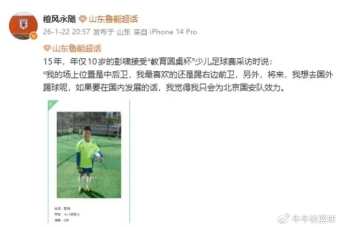 人红是非多,由于在本届U23亚洲杯上的出色表现,彭啸受到了媒体和球迷的热切关注。近日足球博主“橙风永随”发文透露了彭啸10岁时接受媒体采访时的一段话,当时彭啸说:“我在场上的位置是中后卫,我最喜欢的还是踢右边前卫,另外,将来我想去国外踢球,如果在国内发展的话,我觉得我只会为北京国安效力。”有球迷透露,彭啸与山东泰山的合同还有2个月到期,但是山东泰山是否与彭啸完成了续约还不得而知,因此很多球迷担心北京国安会挖走彭啸。
